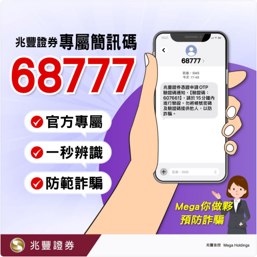 兆豐證券透過專屬短碼簡訊「68777」發送通知訊息!